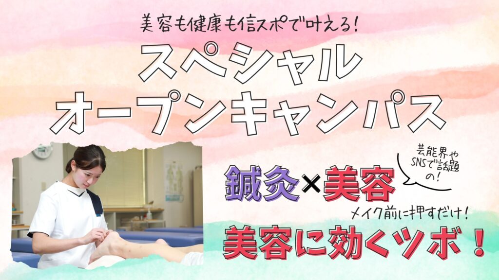 信州スポーツ医療福祉専門学校では、3月20日(金)に「鍼灸×美容スペシャルオープンキャンパス」を開催いたします。当日は、美容分野で活躍する本校卒業生 近藤 美月先生 をお招きし、現場で求められるスキルや仕事の魅力についてお話しいただきます。鍼灸と美容のつながりを体験できる特別プログラムもご用意しています。美容・健康分野に興味のある方はもちろん、