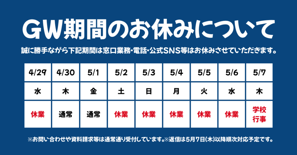 本校は下記の期間、ゴールデンウィーク休業となります。